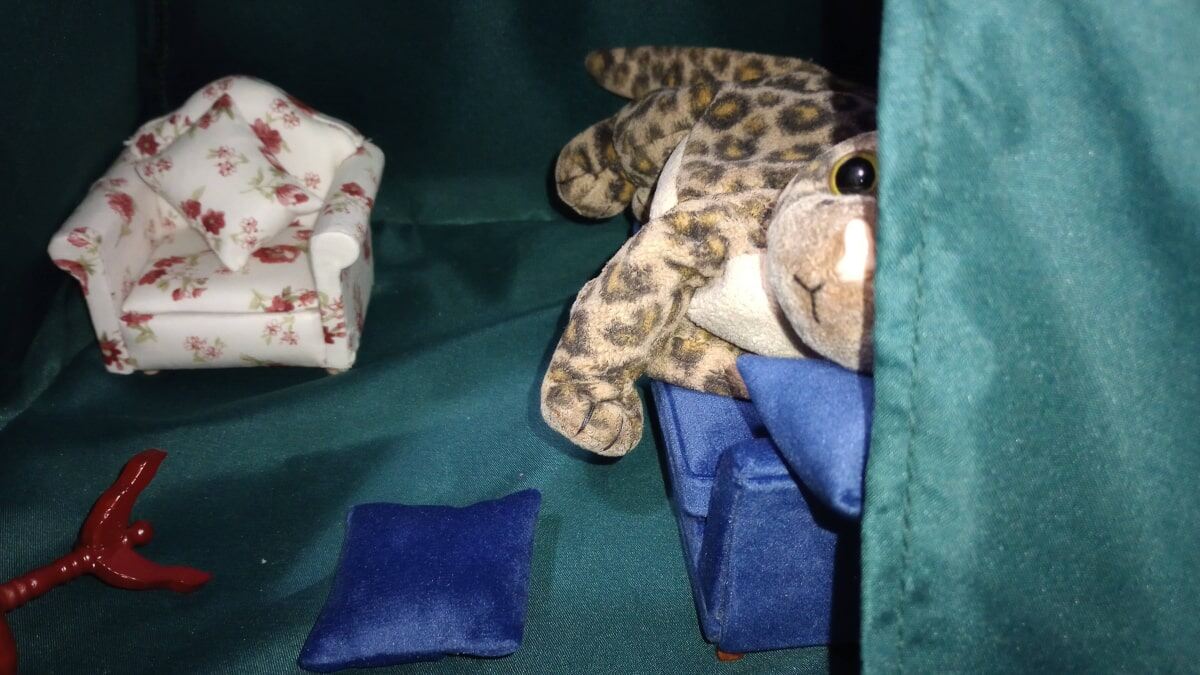One night, while my grandma and I were asleep at a motel in late 2015, we awoke the next morning to find Snacky had once again vanished. My mom looked under her bed and found Snacky on all fours, looking up at her. It was a twin room—the beds were quite far apart, with two nightstands in between.