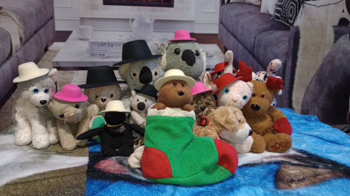 - Brownie: Brownie is the quietest of the group. He's a teddy bear in a Christmas stalking. I feel a bit bad for him because he doesn't have limbs like the others, but we try to make him feel included as much as possible.